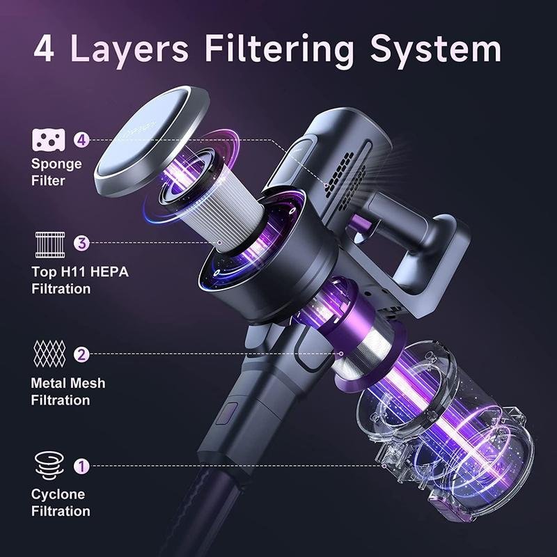 • ldeal for pet owners: with top 11 class HEPA and 4-stage cyclone filtering, 99.7% of dust up to 0.3 μm can be eliminated. Effective removal of pollen, dander and air pollutants. With the interchangeable parts, this cordless vacuum cleaner will be very easy to pick up pet hair and house dust on upholstery or mattresses.